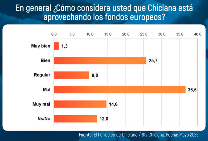 Asimismo, ante la pregunta ¿Cómo considera usted que Chiclana está aprovechando los fondos europeos?, un 51,2 por ciento de las personas que han participado en el Barómetro muestran una opinión negativa, frente a un 27 por ciento de valoración positiva, mientras que 9,8 opta por calificarla de regular.