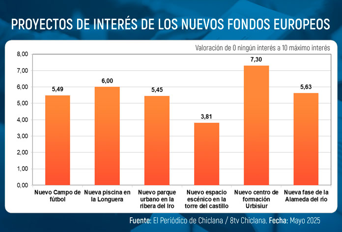 Tras él aparecen proyectos como la nueva piscina en La Longuera, 6.0 puntos; la nueva fase de la Alameda del Río, 5,63; el nuevo campo de fútbol, con un 5,49; o el nuevo parque urbano en la ribera del Iro, con un 5,45.