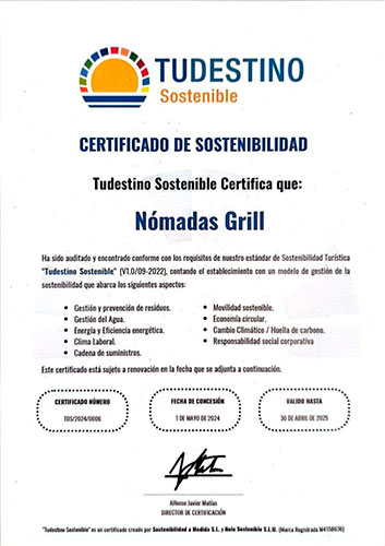 Por su parte, , el director de certificación, Alfonso Javier Matías, ha puesto de relieve que “Nómadas Grill cuenta con un modelo de gestión de la sostenibilidad transversal de su negocio, que desarrolla medidas y objetivos de mejora sobre la gestión de residuos, eficiencia energética, gestión del agua, clima laboral, economía circular, cambio climático y huella de carbono, cadena de suministros y responsabilidad social corporativa”. Además ha destacado aspectos de la gestión del restaurante “como el compromiso con la comunidad, la óptima gestión de los recursos consiguiendo en su cocina casi un desperdicio cero, gracias a las acciones de prevención de residuos, la correcta gestión de su cadena de suministro, donde valora los criterios de bienestar animal en sus compras, el uso de energía 100 por cien renovable y las diferentes medidas de gestión del agua desde la limpieza a la distribución de agua filtrada para los clientes», señalando que «con la concesión de este certificado, Nómadas Grill se une a nuestra comunidad de referencia de empresas turísticas comprometidas con la sostenibilidad”.