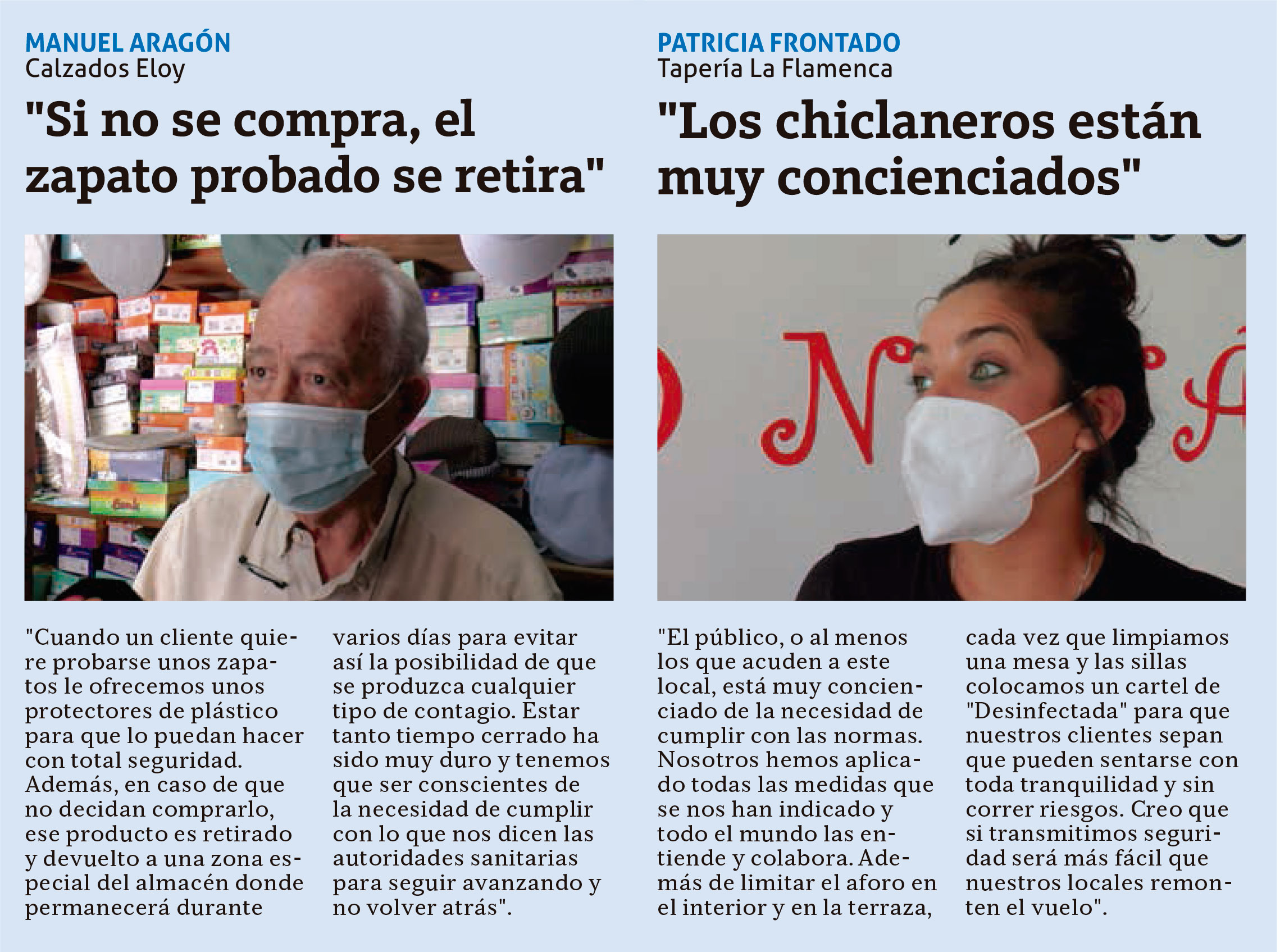 Así, Manuel Aragón ha recalcado que «la gran mayoría de las personas que entran en mi zapatería vienen con mascarilla y utilizan los geles cuando lo creen necesario. Hay algunos que van sin mascarilla pero no entran y se limitan a preguntar desde fuera». En esta misma línea, Patricia Frontado ha destacado que «al principio teníamos algo de miedo por cómo iba a responder nuestros clientes pero hasta ahora el grado de concienciación es muy alto y eso nos hace más fácil nuestro trabajo y poder así atenderles mejor».