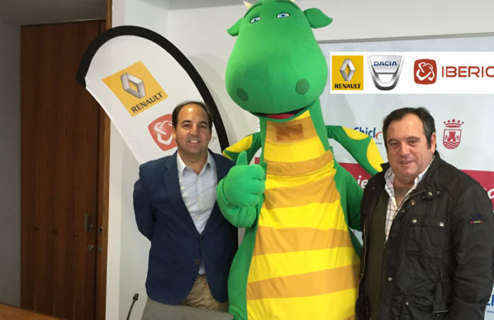 La colaboración entre el concesionario Renault Ibericar Fórmula y el Ayuntamiento ha hecho posible que Chiclana haya sido el lugar elegido para el estreno del musical de «BabyRadio». En la imagen, el director de marketing de Renault Ibericar Fórmula, Guillermo Díaz del Río Fernández de Mesa, y el delegado de Cultura, José Manuel Lechuga, junto al dragón Mon.