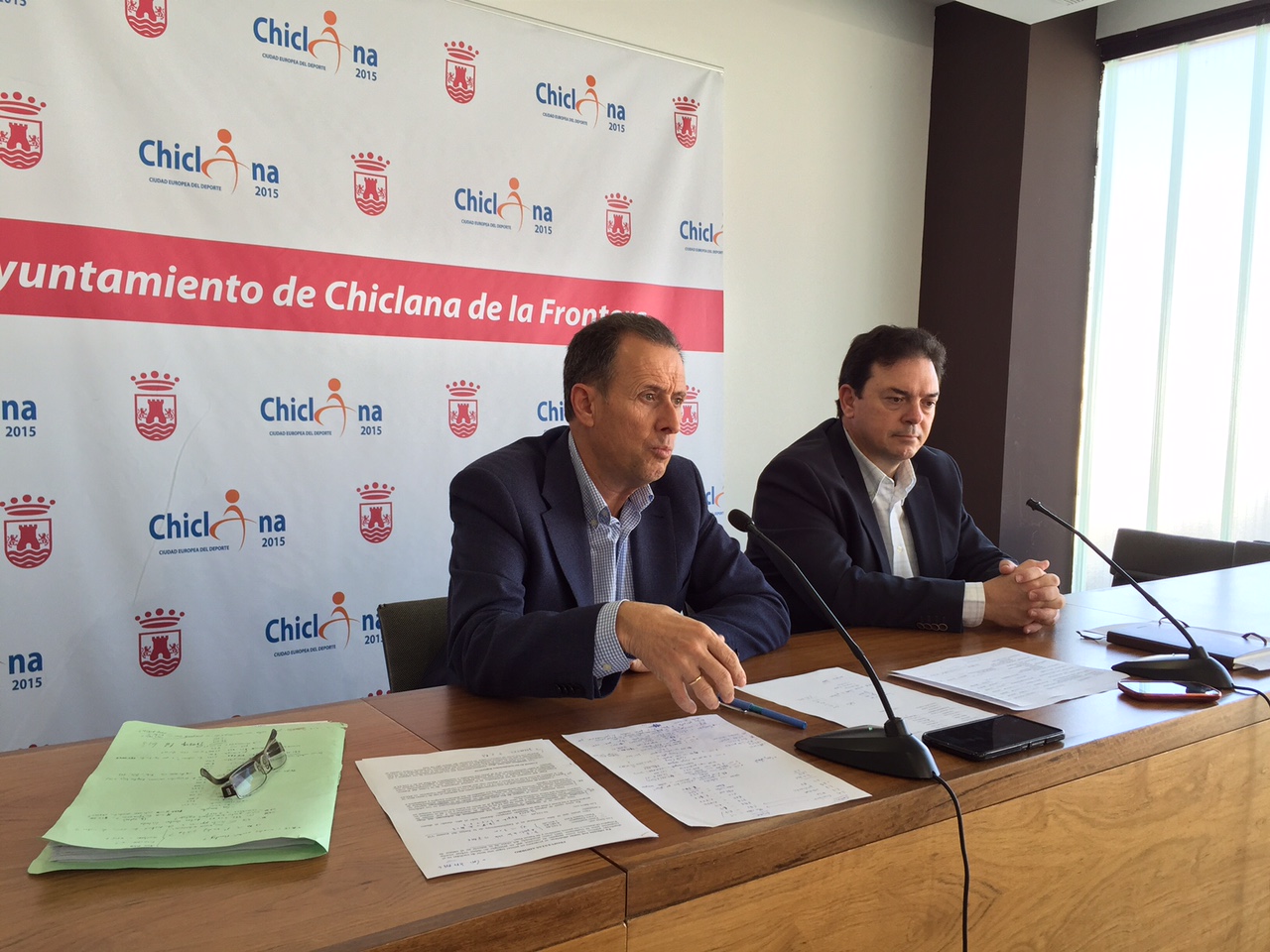 El alcalde de Chiclana, José María Román, junto al delegado de Hacienda, Joaquín Guerrero, ha comparecido hoy ante los medios de comunicación para hablar de las primeras medidas que se van a tomar en relación de nuevos ingresos y reducción de gastos debido a la “no aprobación de las ordenanzas” en el último Pleno Municipal, aunque ya algunas de ellas estaban previstas anteriormente.
