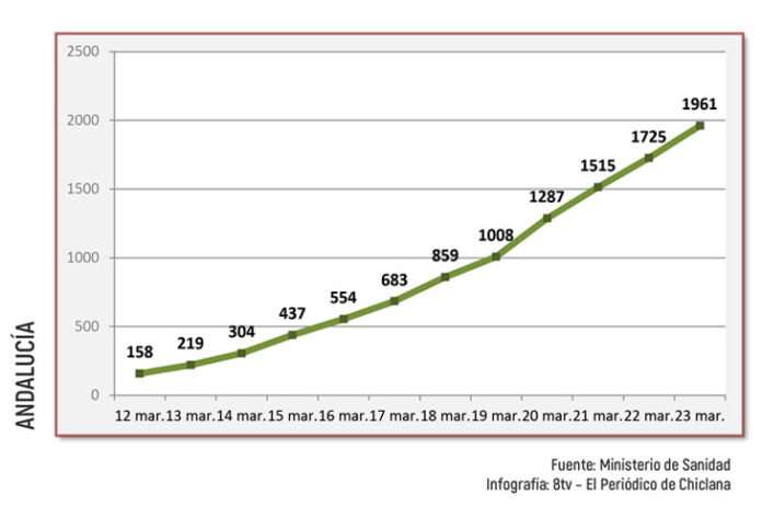 Andalucía suma ya 1.961 afectados por coronavirus, 236 más que este domingo, según los datos aportados por el Ministerio de Sanidad en el balance actualizado con datos a las 11:30h de hoy, que señala que los fallecidos en la comunidad autónoma ascienden a 58, once más. El aumento de enfermos con respecto al día anterior fue de un 13,6%, mientras el domingo se incrementaron los casos un 13,8%, lo que indica una ralentización en la curva de crecimiento de nuevos casos, sobre todo si tenemos en cuenta que de los pasados jueves y viernes, cuando crecían un 27% y 17%, respectivamente.