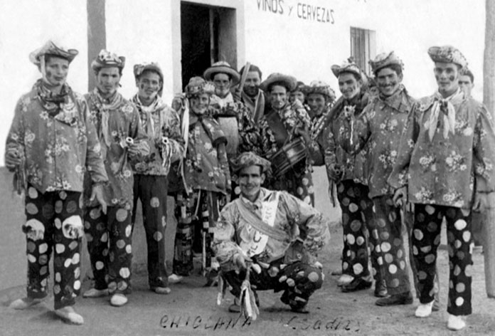 Los datos para la villa de Chiclana, aún son escasos y están íntimamente unidos al carnaval gaditano. La relación comercial y social de Cádiz con nuestra localidad, sobre todo desde el siglo XVI, fue un factor determinante en el carnaval chiclanero. En el libro, “El carnaval secuestrado o historia del carnaval” (2002), del profesor Ramos Santana, de la Universidad de Cádiz, hallamos una referencia Chiclana, que también señala el Dr. Sacaluga Rodríguez en su tesis doctoral (2014): “Chiclana, 6 de febrero de 1763: Es imponderable el número de mercaderes de las calles de San Francisco y San Agustín de Cádiz, que vienen a pasar el carnaval a esta villa, pues desesperanzados del consumo de bujerías, por el acuerdo de las señoras de Cádiz, en la no ampliación de máscaras y Bayles, vienen a tomar los Ayres del Campo, y entretenerse en formar flores, y spiochas, negras y moradas, para imponer nuevos censos a las faldriqueras de los maridos, y cortejantes, hacerlos penitentes, y no arrepentidos”.