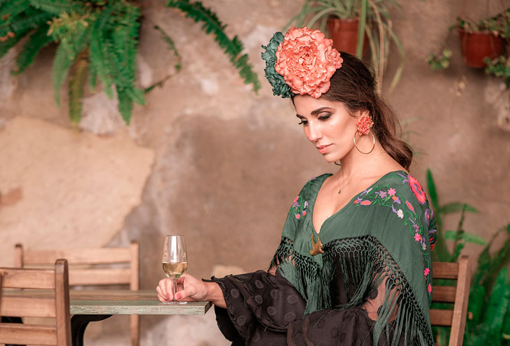 Un trabajo que, al estilo de los clásicos lienzos del pintor cordobés Julio Romero de Torres, muestra a una joven (Ana Manzano) en una pose clásica, en el patio andaluz del restaurante La Embajada, acompañada de elementos simbólicos de la fiesta como podrían ser la imprescindible copa de vino chiclanero o la silla de ‘tijera’.