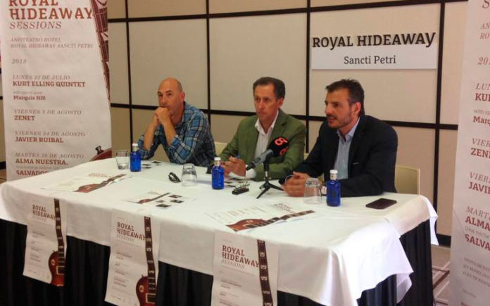 El alcalde de Chiclana, José María Román; el director del Hotel Royal Hideaway Sancti Petri, Ignacio Martín, y el responsable de Jazz Vejer, Nacho Corral, han presentado las Royal Hideaway Sessions, que se desarrollarán este verano en el anfiteatro de esta instalación hotelera. Un acto en el que también ha estado presente la delegada municipal de Turismo, Ana González.