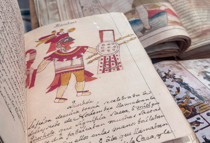 Tras ellos, una fecha clave para nuestra lengua y para nuestra Historia: 1492. Dos acontecimientos marcarán el devenir de la lengua española: por un lado, la publicación de la Gramática española de Nebrija -que aquí mostramos acompañada de su sintaxis o de su diccionario latino comentado en español; por otro, el encuentro con América, que no sólo propiciará la expansión de nuestra lengua, sino que, además, la enriquecerá. Una vitrina dedicada íntegramente a esta época recoge bellísimos códices que subrayan el interés por preservar la cultura y la lengua aborígenes -y a éstos aborígenes mismos- por parte de ilustres españoles, así como obras en español producidas por nativos americanos.