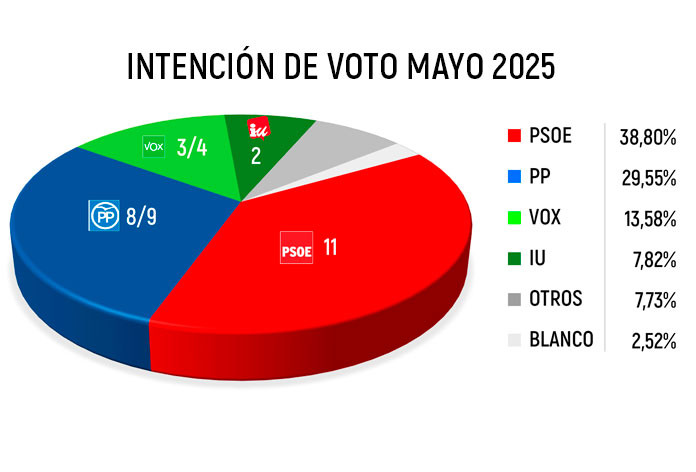 De esta manera, los socialistas mantendrían su posición como fuerza mayoritaria, con una ligera bajada en la intención de voto, pasando del 39,56 conseguido en las elecciones municipales de 2023 al 38,80 actual, un 0,76 menos.