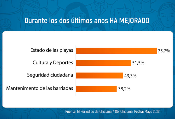 También la Seguridad Ciudadana presenta buenos datos con un 43,3 por ciento de ciudadanos que la sitúan en un lugar destacado en cuanto a mejoras. Por su parte, los trabajos de mejora que se han venido realizando en las distintas barriadas de la ciudad son el elemento que más ha mejorado para un 38,2 de los chiclaneros.