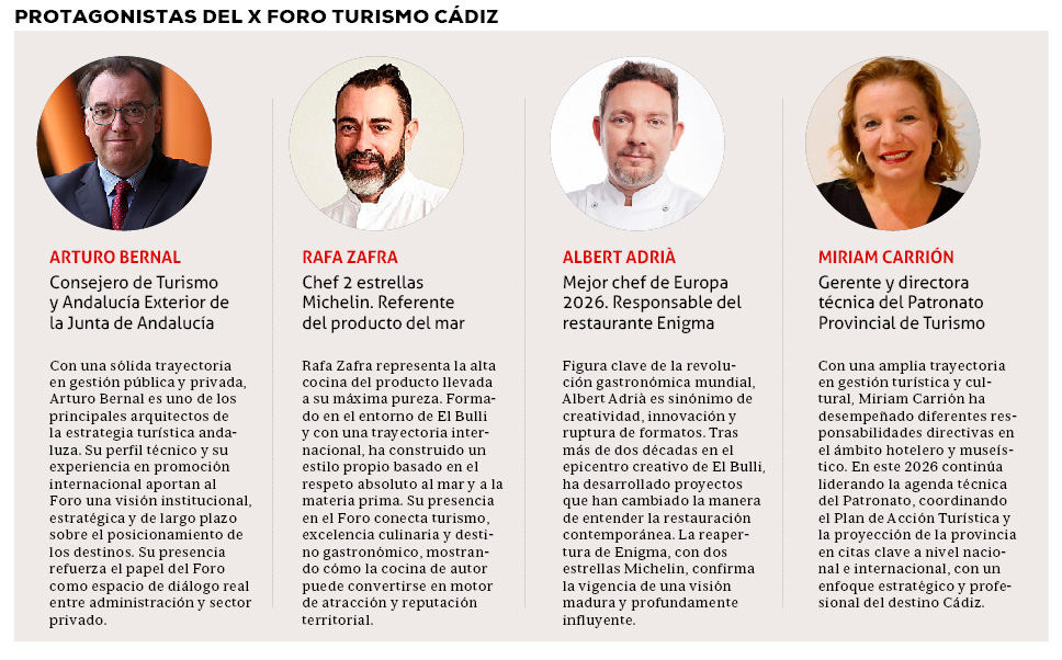 Una cita consolidada como el gran punto de encuentro del sector turístico y hostelero gaditano y que será inaugurada por el consejero de Turismo y Andalucía Exterior de la Junta, Arturo Bernal, quien presentará el programa Andalucía Nexus, una plataforma que permite cruzar información procedente de ámbitos como la movilidad, la ocupación turística, el consumo, los eventos o la climatología, generando modelos predictivos que faciliten una planificación más eficiente y sostenible de los destinos.