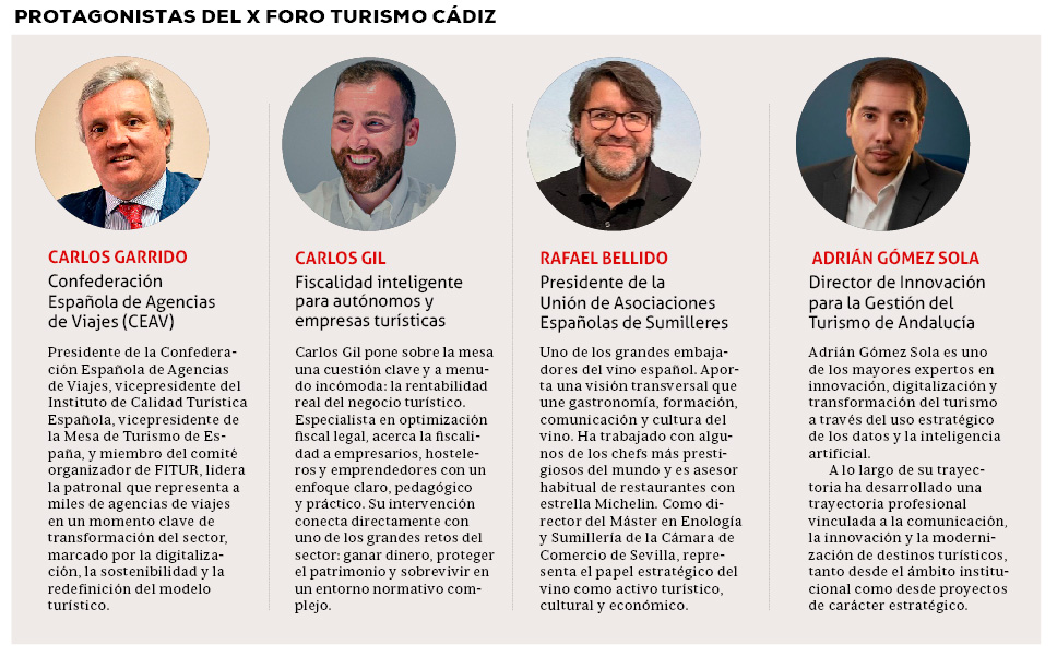 Junto a todos ellos, las administraciones públicas estarán representadas por Mirian Carrión, Gerente y directora técnica del Patronato Provincial de Turismo de Cádiz, y Adrián Gómez Sola, Director de Innovación de la Empresa Pública para la Gestión del Turismo de Andalucía.